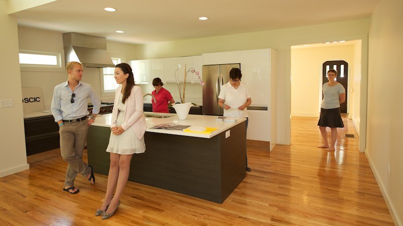 Left to right: Andrea, Lee, and Jennifer looking through brochures in the kitchen.