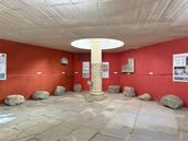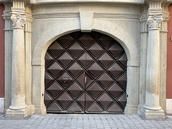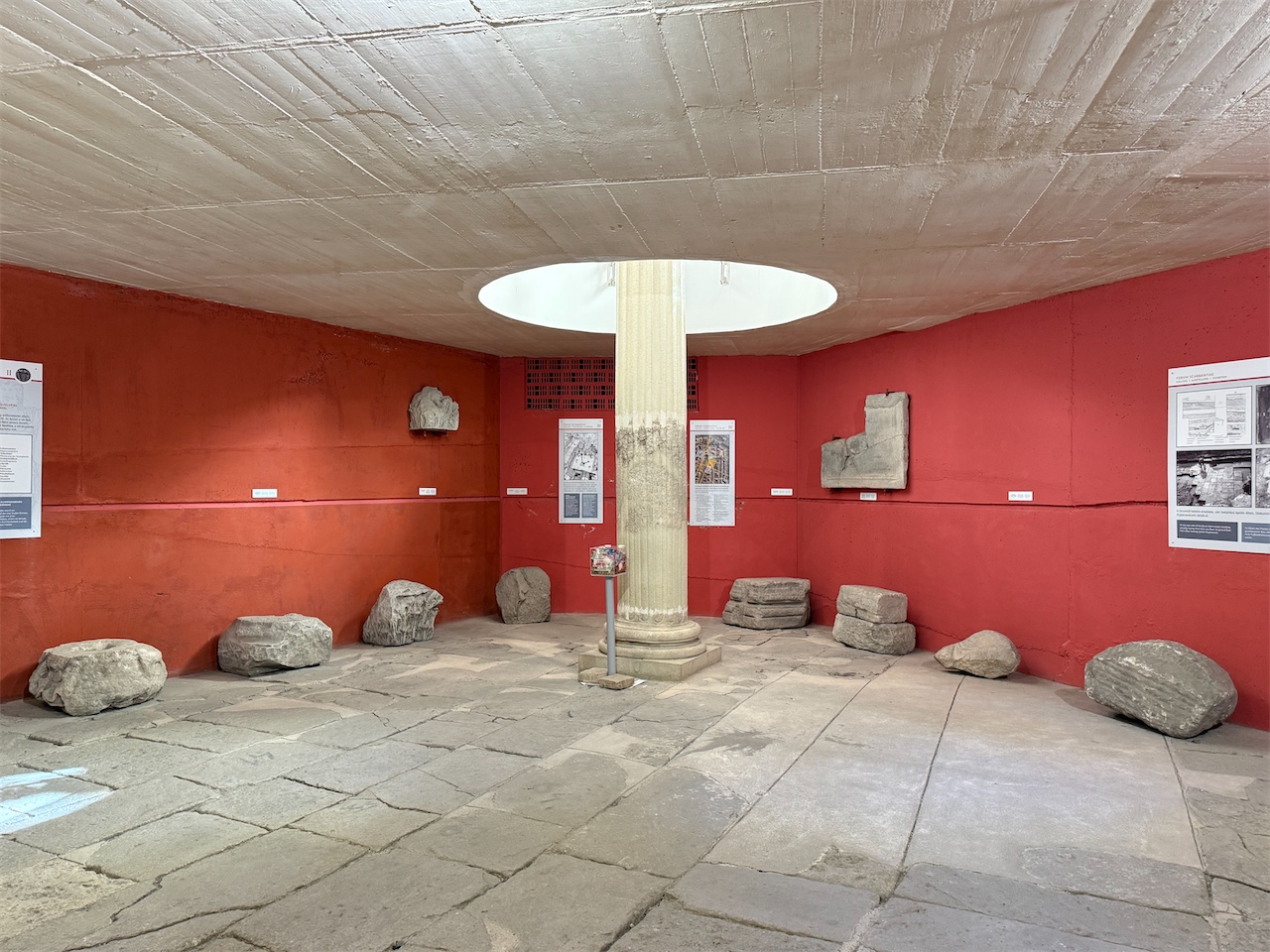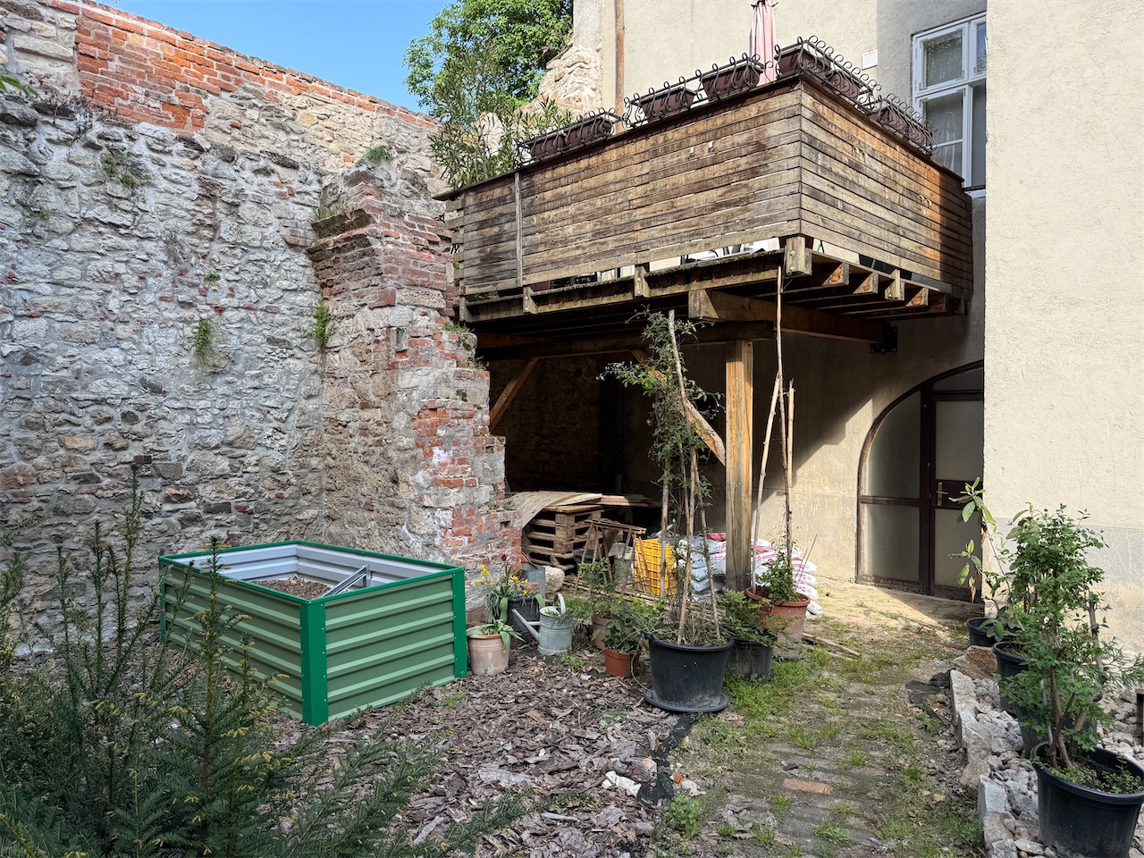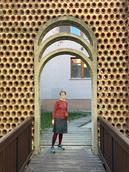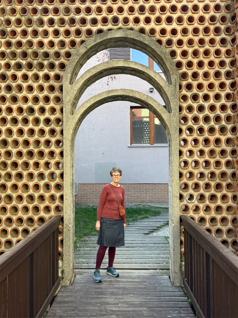 Jennifer in a gap in the city walls that had been ornamentally filled with a clay-pipe wall.